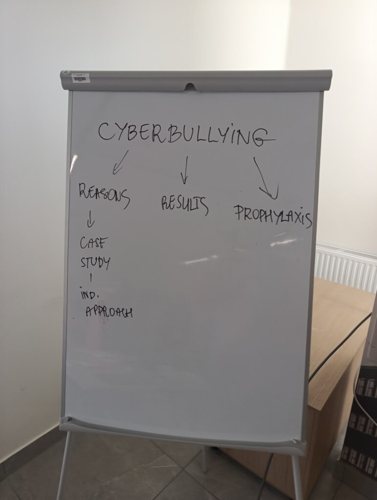 Βασικό στοιχείο του εργαστηρίου ήταν στοιχεία της βιβλιοθεραπείας, συμπεριλαμβανομένης της μεγαλόφωνης ανάγνωσης μιας ιστορίας με τίτλο. “Όλα τα μάτια πάνω μου” από το βιβλίο “Στο μονοπάτι της ύποπτης συμπεριφοράς” του Artur G trobka, καθώς και ένα δράμα βασισμένο στην πλοκή. Τα παιδιά έπαιξαν τον εαυτό τους στους ρόλους του καταπιεστή και του θύματος, που τους επέτρεψε να εντοπίσουν συναισθήματα, να απελευθερώσουν την ενσυναίσθηση και να υιοθετήσουν